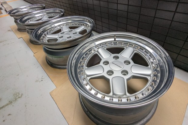 This set of four 17″ AC Schnitzer Type I wheels features a five-spoke design finished in silver with polished lips, a three-piece construction, and was said to be removed from a BMW E30 M3. The wheels have marks for part numbers, production dates, and sizing specifications, as well as valve stems and AC Schnitzer-branded center caps. The set of AC Schnitzer wheels is now offered at no reserve in Joetsu, Japan.