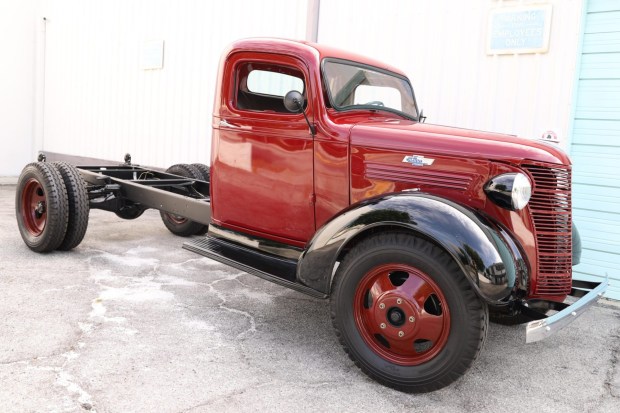 This 1938 Chevrolet Series TC 1.5-ton chassis cab truck was purchased by its current owner in 2006 and delivered to D&P Classic Chevy of Westminster, California, where a rebuilt 235ci Stovebolt inline-six was installed in 2009. The truck’s refurbishment, which had been started under previous ownership, was completed in 2016 and further involved a repaint in red and black over a body-color interior housing a brown vinyl bench seat. The replacement engine is mated to a rebuilt four-speed manual transmission and additional equipment includes a Rochester one-barrel carburetor, four-wheel hydraulic drum brakes, …