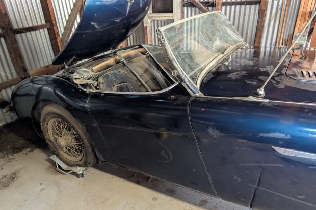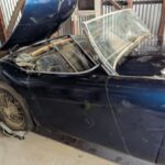 This 1953 Austin-Healey 100 BN1 roadster is said to have been purchased new by the original owner through a broker out of San Pedro, California, in 1953 before being acquired by the seller’s grandfather in 1954. The car was repainted blue at some point in the 1950s or 1960s before being passed to the seller in 1976 and is said to have remained parked for the last 49 years. Chassis BN1L147431 retains its 2.7-liter inline-four as well as its three-speed manual transmission and sits on movable dollies with casters. Accompanying parts and components include dual SU carburetors …