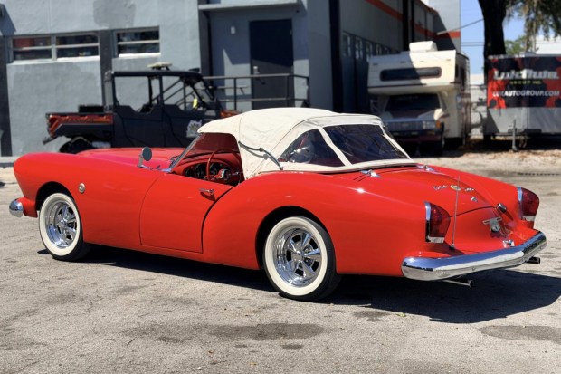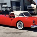 This 1954 Kaiser Darrin is #49 of 435 production examples built for a single model year and is powered by a 161ci inline-six paired with a three-speed manual transmission. The car is finished in red over red and white, and features include a three-position soft top, 15″ wheels with Mag-style covers, and sliding doors that retract into the body. This KF161 Darrin was acquired by the selling dealer in 2026 and is now offered in Florida with an Illinois title.