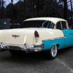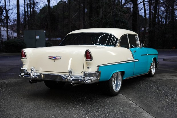 This 1955 Chevrolet 210 two-door hardtop was the subject of a custom build around 2006 that involved the installation of a 383ci V8 crate engine along with a Tremec five-speed manual transmission and a Ford 9″ rear end. The body was refinished in ivory and turquoise, and the chassis has been modified with tubular front control arms, a rear four-link setup, adjustable coilovers, and power-assisted four-wheel disc brakes. Inside, the bench seats are trimmed in ivory and turquoise and accompanied by an aftermarket air conditioning system, a tilt steering column, digital gauges, a RetroSound stereo, …