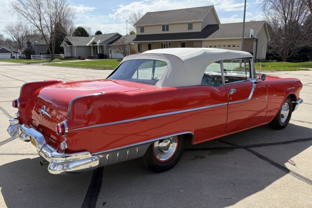 This 1955 Pontiac Star Chief convertible coupe underwent cosmetic work prior to the selling dealer’s 2023 acquisition that involved a repaint in red and a refresh of the red and white interior. Equipment includes a power-operated white soft top, power windows, a power-adjustable front bench seat, and a retro-look radio. The 287ci V8 is fitted with a Carter four-barrel carburetor and linked with a four-speed Strato-Flight automatic transmission. The car rides on 15″ steel wheels and also has power-assisted brakes and power steering. This Star Chief is now offered with a clean Nebraska title.