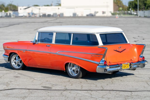 This 1957 Chevrolet 210 Handyman two-door wagon was purchased by the seller’s father in 1991, and the seller notes refurbishment and modifications have been performed over the decades since. A 383ci stroker V8 was installed approximately 10 years ago and is linked to a TH400 three-speed automatic transmission and a 9″ rear end. The body is finished in orange and white paint and features tinted glass along with a split tailgate and stainless and chrome trim. Inside, the bench seats are trimmed in black cloth and accompanied by Vintage Air climate control, power windows, a Kenwood stereo unit, and Classic Instruments gauges. Additional equipment includ …
