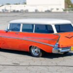 This 1957 Chevrolet 210 Handyman two-door wagon was purchased by the seller’s father in 1991, and the seller notes refurbishment and modifications have been performed over the decades since. A 383ci stroker V8 was installed approximately 10 years ago and is linked to a TH400 three-speed automatic transmission and a 9″ rear end. The body is finished in orange and white paint and features tinted glass along with a split tailgate and stainless and chrome trim. Inside, the bench seats are trimmed in black cloth and accompanied by Vintage Air climate control, power windows, a Kenwood stereo unit, and Classic Instruments gauges. Additional equipment includ …
