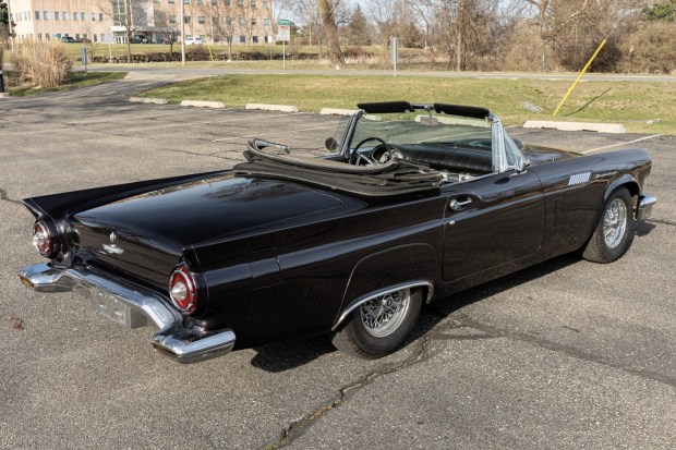 This 1957 Ford Thunderbird left the factory with a D-code 312ci V8 paired with a three-speed Fordomatic automatic transmission, Colonial White paintwork, and a black-and-white interior. The car was cosmetically refinished at some point and now has metallic dark purple paintwork, wire-spoke wheels, a reupholstered interior with a modern sound system, and a black soft top. The car was purchased in 2020 by the current owner, who describes it as a running-and-driving project that will require rust repairs on the frame along with suspension and braking services. This Thunderbird is now offered on dealer consignment at no …