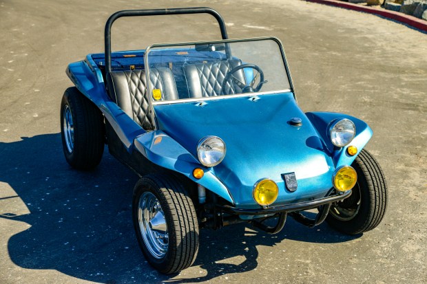 This Meyers Manx dune buggy is powered by a 1.6-liter dual-port flat-four mated to a four-speed manual transaxle, and its fiberglass bodywork is finished in blue metalflake. The car rides on 15″ chrome wheels and is further equipped with a roll bar, a rear storage box, drum brakes, fog lights, and two bucket seats upholstered in black vinyl. It was purchased by the seller in 2026, and subsequent work included installing a Sidewinder exhaust system, adjusting the valves, setting the ignition timing, servicing the brakes, and replacing the rear axle seals. T …