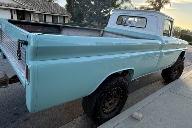 This 1962 Chevrolet C10 Fleetside pickup is a running project that was acquired by the seller in 2006 and has been converted to four-wheel drive using the NP205 transfer case and front and rear axle setups sourced from a 1987 K5 Blazer. Other work has involved rebuilding the 350ci V8 with replacement internals and an “RV” camshaft as well as rebuilding the three-speed automatic transmission, replacing the brakes, and installing 17″ Raceline wheels wrapped in 35″ tires. The truck rides on lifted suspension, and it has been refinished in teal with a white cab, grille, and front bumper. Other details …