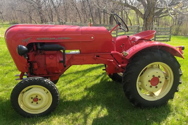 This 1962 Porsche-Diesel Junior 108L tractor underwent a refurbishment prior to being imported to the US from Germany in 2017. Powered by an air-cooled 822cc diesel single linked to a dual-range three-speed manual transmission, the tractor is painted red and is equipped with headlights, taillights, and turn signals. Additional equipment includes a rear-hinged engine cover, a spring-suspended steel seat, central and rear power take-offs, an adjustable rear drawbar, front and rear pin hitches, and beige-painted steel wheels. This Porsche-Diesel Junior tractor was purchased by the seller on BaT in May 2018 and is now offered at no rese …