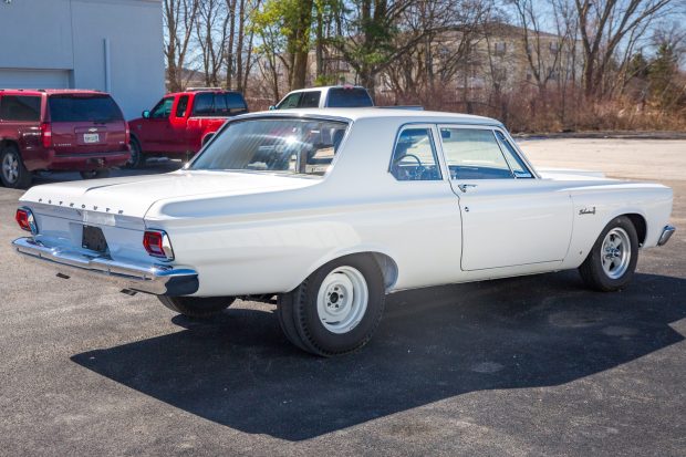 This 1965 Plymouth Belvedere I is a white-over-tan two-door sedan that was modified in the style of a Super Stock example before it was acquired by the selling dealer in 2022. It is powered by a 426ci Hemi V8 with dual Holley four-barrel carburetors, and the replacement four-speed manual transmission is linked to a limited-slip differential. Equipment includes a Hurst shifter, a metal radio-delete plate, aftermarket gauges, tan vinyl bucket seats, custom headers, quarter vent windows, a hood scoop, American Racing front wheels, front disc brakes, and racing slicks on the rear steel wheels. This modified Belvedere I is now offered by the selling dealer with a clean Ohio title.