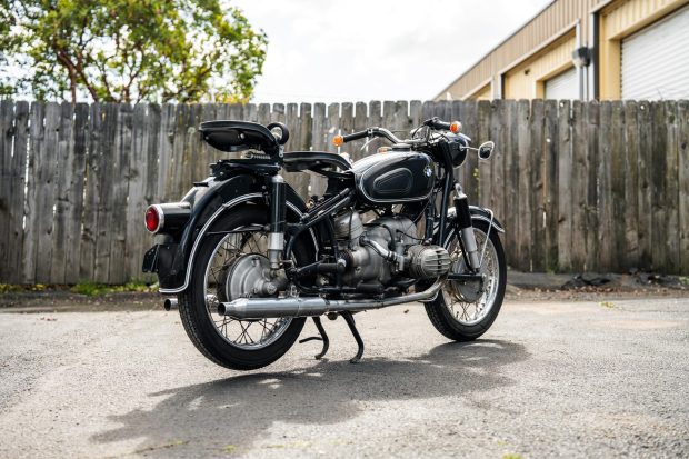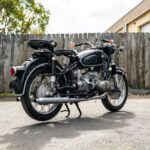 This 1966 BMW R60/2 is powered by a 594cc opposed-twin linked to a four-speed transmission and an enclosed driveshaft and is finished in black with white stripes. It is equipped with an Earles fork, preload-adjustable rear shocks, 18″ wire-spoke wheels, and dual Bing carburetors as well as Albert headlight mirrors, Hella bar-end turn signals, Denfeld rider and passenger saddles, a hinged rear fender, a frame-mounted tire pump, and a fuel tank with an integrated locking storage compartment. This R60/2 was purchased by the seller’s late husband in 2014 and is now offered at no reserve with a c …