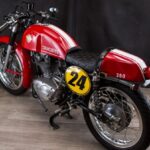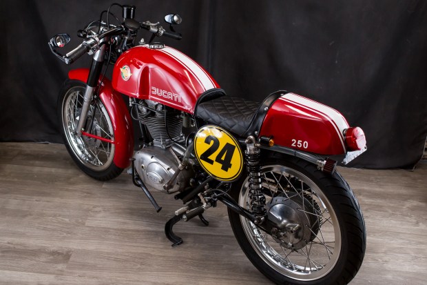 This 1966 Ducati 250 was acquired by the seller in 2016 and was subsequently rebuilt as a cafe racer with a lowered handlebar, rear-set foot controls, a bump seat, bar-end mirrors, a tachometer, and a Powerdynamo generator and electronic ignition system. The bike is finished in red with white stripes and is equipped with a 248cc four-stroke single paired with a five-speed transmission. The bike has remained on static display for the past three years, and it was previously listed on BaT in July 2025. This 250 cafe racer is now offered with spare parts, a service jack, a rear-wheel stand, s …