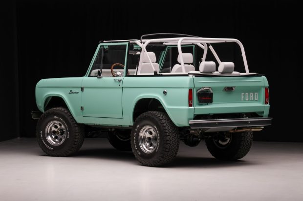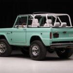 This 1966 Ford Bronco rides on a lifted suspension over 15″ Center Line wheels and four-wheel disc brakes, and the replacement 302ci V8 has been fitted with an aluminum radiator, a CVC serpentine drive system, a Painless wiring harness, and a Weiand intake manifold. The truck is finished in light jade over white leather and is also equipped with a Tremec five-speed manual transmission, a dual-range transfer case, a white soft top, LED headlights, AMP Research power side steps, power steering, locking front hubs, air conditioning, power windows, Dakota Digital gauges, …
