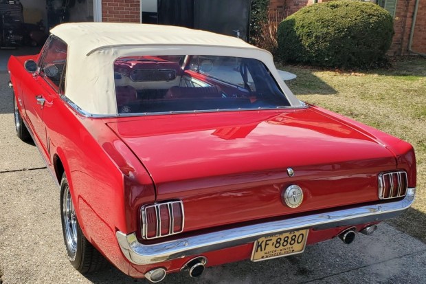 This 1966 Ford Mustang began as a Vintage Burgundy T-code 200ci convertible, and it was rebuilt and modified by a previous owner. The exterior was repainted red and fitted with GT-style equipment and a white soft top, front disc brakes and 14″ styled-steel wheels were added, and a 302ci V8 was installed along with a four-barrel Edelbrock carburetor and a dual exhaust system. The interior was redone with red-and-white Pony upholstery, and a hidden Pioneer stereo was added. The seller acquired the car in 2024 and has since added 205/70 BFGoodrich rubber. This Mustang is now offered with a c …