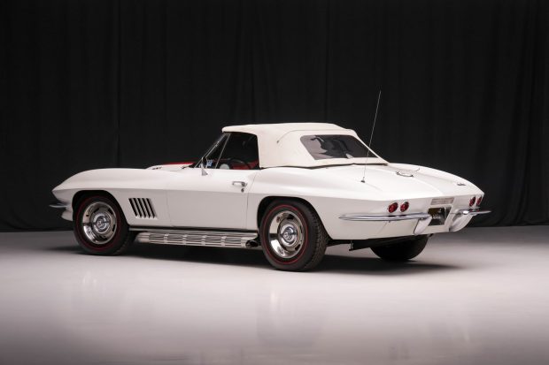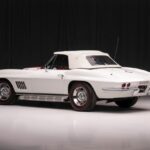This 1967 Chevrolet Corvette convertible was first delivered to George Irvin Chevrolet of Denver, Colorado, and later refurbished, earning NCRS Top Flight recognition in 2006. The 427ci L36 V8 was rebuilt in 2020, and it is paired with a four-speed manual transmission. The car is finished in white over red vinyl upholstery and equipped with a white convertible soft top, 15″ Rally wheels, four-wheel disc brakes, side-exit exhaust pipes, air conditioning, an AM/FM radio, chrome bumpers, and retractable headlights. This C2 was acquired by the selling dealer, a BaT Local Partner, in 2026, and is now offe …