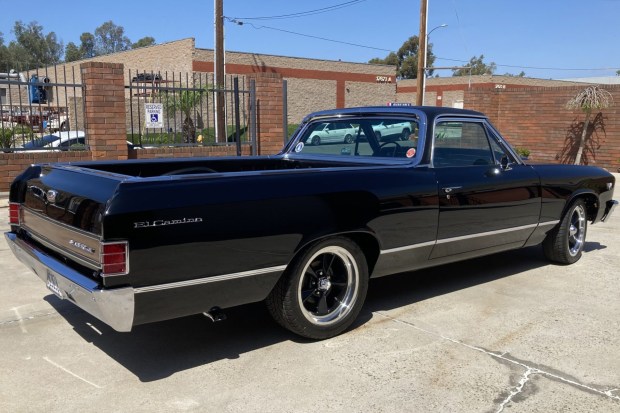 This 1967 Chevrolet El Camino is equipped with a 396ci V8 that utilizes a revised camshaft, a billet distributor, and Hedman headers, and power is routed to a rebuilt 12-bolt limited-slip rear end through a 700R4 automatic transmission. The car rides on a lowered suspension and US Mags five-spoke wheels, and it is further equipped with a twin-dome hood, power front disc brakes, power steering, an aluminum radiator, and twin electric fans. The body is finished in black with a color-keyed vinyl roof cover, and it was repainted circa 2024 as part of mechanical and cosmetic refurbishment work tha …
