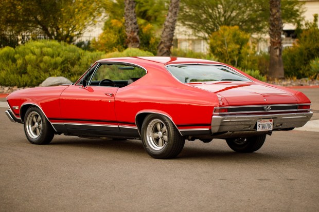 This 1968 Chevrolet Chevelle SS 396 sport coupe was repainted red and fitted with a replacement 396ci V8 during a 2016 refurbishment that also involved re-trimming the interior with black vinyl upholstery. The four-speed manual transmission is linked to a 12-bolt rear end, and 15″ American Racing Daisy wheels are mounted over power-assisted front disc brakes and rear drums. Inside, a center console is flanked by bucket seats in the front, and a Custom Autosound stereo is installed along with a Sparco steering wheel and a Vintage Air climate control system that has a leak in the air conditioning sys …