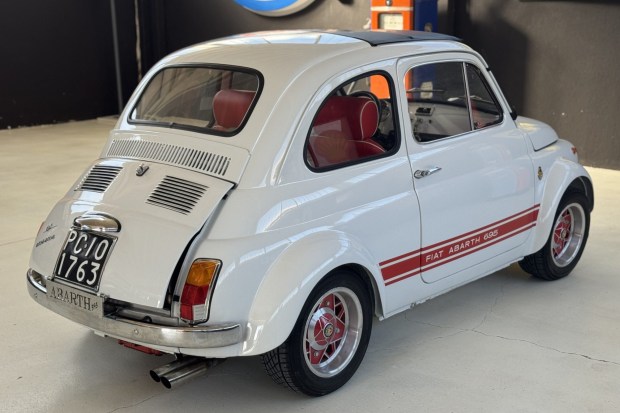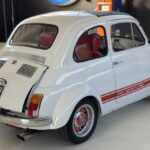 This 1968 Fiat 500F was modified in the style of an Abarth 695 SS as part of a project completed in 2008. The car is finished in white and features red side accents along with body-color wheel-arch flares. It rides on 12″ Mille Miglia alloy wheels and is powered by an air-cooled 499cc twin paired with a four-speed manual transaxle. Inside, red vinyl–trimmed seats are accompanied by a Blaupunkt stereo. Further equipment includes a folding canvas roof panel with an Abarth logo as well as an Abarth-branded steering wheel, oil pan, and sport ex …