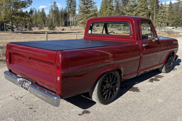 This custom pickup was built by its prior owner using the shortened body of a 1968 Ford F-250 mated with the chassis and running gear from a 2004 Ford Crown Victoria police interceptor. The truck is powered by a 4.6-liter V8 mated to a four-speed automatic transmission with overdrive, and the truck features four-wheel disc brakes and power steering. It was repainted in maroon, and the interior houses two-tone tan TMI seats, a RetroSound stereo, Vintage Air air conditioning, and Dakota Digital gauges. Additional equipment includes a dual exhaust system, a reverse came …
