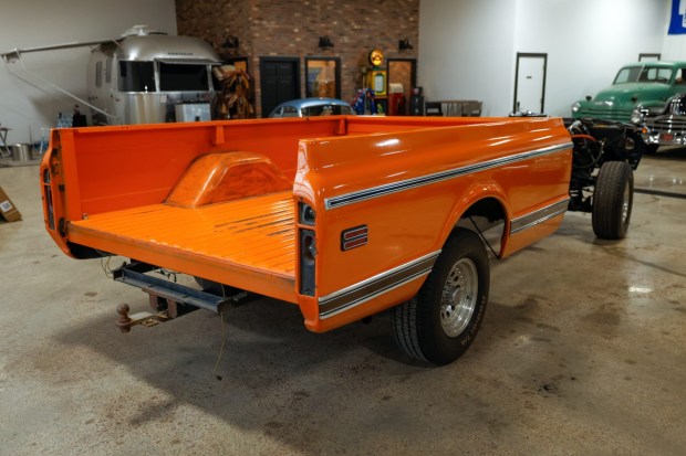 This 1969 Chevrolet C10 chassis was separated from its cab and front body panels in 2026 by the selling dealer, who notes the cab and front panels will be used in a custom build in combination with a replacement chassis. The included long bed is finished in orange, and the chassis wears black paint. The 396ci big-block V8 features a Quadrajet four-barrel carburetor and Mallory ignition components, and it is linked to a TH400 three-speed automatic transmission and a 12-bolt rear end. Polished 15″ wheels are mounted over four-wheel drum brakes, and the chassis features an independent front …