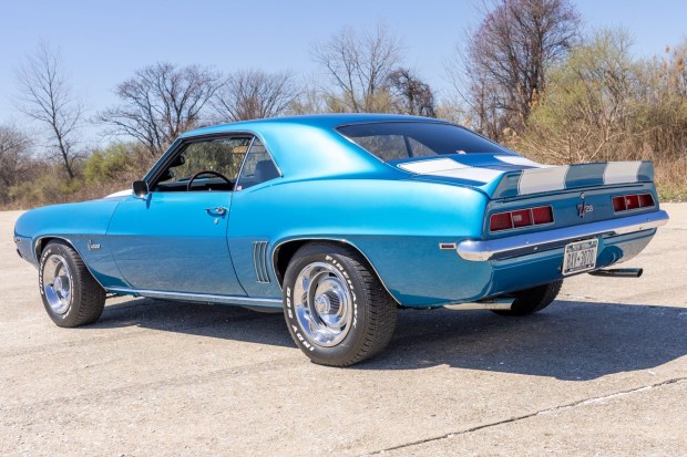 This 1969 Chevrolet Camaro Z/28 coupe is finished in blue with white stripes, and the replacement drivetrain consists of a small-block V8 and a Muncie four-speed manual transmission. Equipment includes long-tube headers, a PosiTraction differential, a cowl induction hood, 15″ Rally wheels, chrome bumpers, front and rear spoilers, power steering, and front disc brakes. The cabin is appointed with woodgrain trim, a center console, a retro-look stereo, and black vinyl bucket seats. This Camaro Z/28 coupe was acquired by the seller in 2004 and is now offered with a MacNeish Certificate of Authenticity and report along with transferable New York registration in the seller’s name.