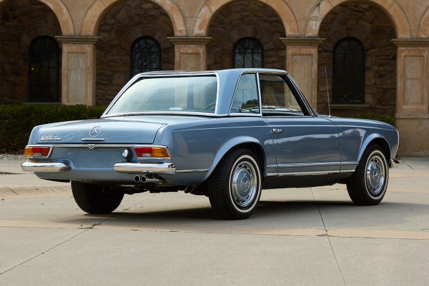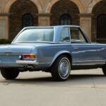 This 1969 Mercedes-Benz 280SL is a Euro-market example that was imported to the US from England in 2025, when it was acquired by the selling dealer. Subsequent work involved reupholstering the interior, installing a vintage-look Bluetooth stereo, and replacing the exhaust system, fuel pump, brake booster, various engine oil gaskets, the spark plugs, clutch master cylinder, and sway bar end links. The car is finished in Gray Blue Metallic over blue MB-Tex and is powered by a 2.8-liter inline-six paired with a four-speed manual transmission. Equipment includes a blue convertible top, a rem …