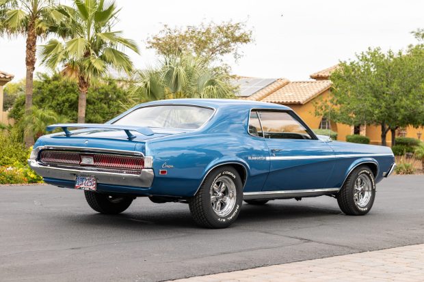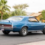 This 1969 Mercury Cougar was specified from the factory in Bright Blue Metallic with a color-coordinated interior, the Eliminator Package, heavy-duty suspension, and power steering and front disc brakes. Originally powered by an M-code 351ci V8 linked to an FMX automatic, the car was retrofitted with a 428ci V8 and a C-6 automatic by a previous owner before 2018, and it was cosmetically refurbished as well. 15″ American Racing wheels, headers, an Edelbrock intake manifold, and Cobra-script finned valve covers were also added. The seller purchased the car in 2019 and has since added approximately 300 miles. This 428-powered Cougar Eliminator is now offered with a Deluxe Marti Report, a win …