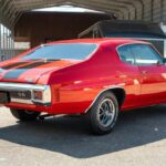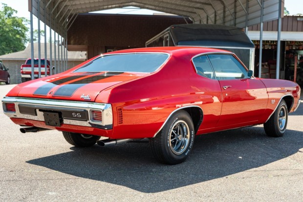 This 1970 Chevrolet Chevelle SS 396 sport coupe is finished in red with black stripes over saddle upholstery, and it was refurbished circa 2004. The 402ci Turbo-Jet V8 is mated to a TH400 three-speed automatic transmission and a 12-bolt PosiTraction rear end, and it is further equipped with Hotchkis suspension components, power steering, 14″ Sport wheels, power front disc brakes, a BeCool radiator, twin electric fans, and a dual exhaust system with MagnaFlow mufflers. The cabin is outfitted with front bucket seats, a horseshoe-style console shifter, air conditioning, and front-seat shoulder belts. This Chevelle SS 396 was acquired by the selling dealer in 2024 and is now offered with …