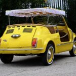 This 1971 Fiat 500F underwent a Jolly conversion and was fitted with an air-cooled 650cc inline-twin mated to a synchronized four-speed manual transaxle as part of a build completed in 2025. Finished in yellow, the car rides on body-color 12″ steel wheels and features a fringed surrey top as well as tubular bumpers and grab rails. The open cabin houses wicker seating along with side safety ropes. This Jolly-style 500F is now offered on dealer consignment in Podenzano, Italy, with Italian registration.