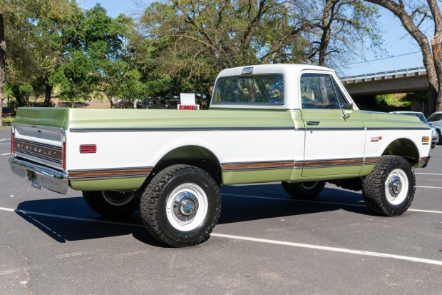 This 1972 Chevrolet K10 Cheyenne 4×4 pickup was refurbished in 2026, and work is said to have included installing a 396ci BluePrint Engines V8 and overhauling the 700R4 four-speed automatic transmission and the NP205 dual-range transfer case. Additionally, body panels were replaced, the truck was repainted, the frame was refinished, and the interior was refreshed. Additional equipment includes a Holley Sniper EFI system, an aluminum radiator, an MSD ignition system, a Boyd’s Welding aluminum fuel tank, a 4″ Rough Country suspension lift, 17″ wheels, TMI Products bucket seats, Vintage Air climate control, a RetroSound stereo, and Kicker spe …