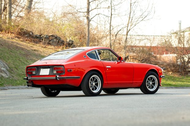 This 1973 Datsun 240Z was sold new from Ernie McKay of Evanston, Illinois, on May 12, 1973, and remained in the care of its original owner until it was acquired by the current owner on BaT in June 2018. Work since that time has involved retrimming the seats in black vinyl, installing a Mishimoto radiator, an electric auxiliary cooling fan, rear disk brakes, and 15″ Konig wheels, and replacing the power antenna, turn signal relay switch, headlight bulbs, seat belts, and ignition components. Refinished in Persimmon Red, the car is powered by a 2.4-liter inline-six paired with a four-speed manual transmission. Additional equipment includes acrylic headlight cov …