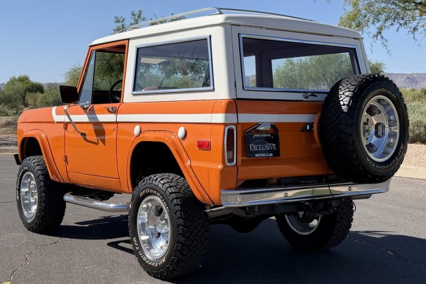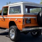 This 1975 Ford Bronco Ranger was initially delivered to the west coast of Canada, finished in Parrot Orange. Under previous ownership, the 302ci V8 was replaced and fitted with an Edelbrock carburetor and a five-speed manual transmission, and East Coast Gear Supply differentials were installed. A James Duff suspension lift kit, WARN manual locking front hubs, power steering, and four-wheel disc brakes were additional modifications. The refinished orange truck features 17″ five-spoke wheels, a white removable hardtop, a Hanson Off-Road front bumper, a Keeper winch, a roof rack, a raised-cowl hood, tubular side steps, and dual fuel tanks. Inside, the front buck …