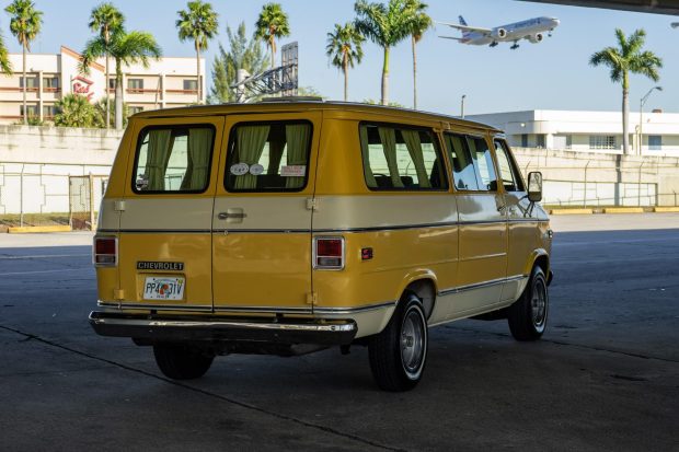This 1977 Chevrolet G20 Sportvan was specified with the Beauville Equipment Group and a two-tone yellow paint scheme that is complemented by tan and plaid upholstery. Other details include power steering, air conditioning, woodgrain interior trim, window curtains, and front captain’s chairs along with two rows of bench seating. A 350ci V8 and a replacement three-speed automatic transmission were installed under prior ownership. The van rides on 15″ rally-style wheels and is also equipped with front disc brakes, a sliding side door, and rear barn doors. Acquired by the selling dealer in 2025, this G20 van is now offered with a clean Flor …
