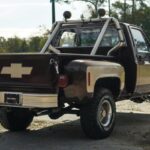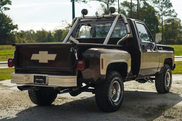 This 1978 Chevrolet K10 Scottsdale 4×4 was finished in a two-tone brown and tan paint scheme under prior ownership and is equipped with a wood-lined Stepside bed and a roll-bar with a pair of auxiliary lights. The replacement 350ci V8 is equipped with a Holley carburetor and backed by a three-speed automatic transmission and a dual-range transfer case. Other details include power steering, Warn manually locking front hubs, rally-style 15″ wheels, a receiver hitch, and a dual exhaust system. The bench seat is trimmed in tan cloth with brown vinyl accents, and the cabin also has a retro-look Bluetooth head un …