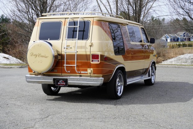 This 1982 Chevrolet G20 van was upfitted by Day Cruiser Corporation of Elkhart, Indiana, and it was acquired by the selling dealer on BaT in September 2025 following history in Oklahoma and North Carolina. Subsequent work included mounting 20″ American Racing wheels, rebuilding the locking differential, and replacing the exhaust system, oil pan gasket, and brake master cylinder. The cabin houses four captain’s chairs trimmed in tan velour as well as a Pioneer sound system, a folding rear bench seat, overhead lighting, privacy curtains, and a cooler box, while the tan exterior is accented with multi-tone graphics. Power is provided by a 5.0-liter V8 paired with a three-speed automatic transmission, a …