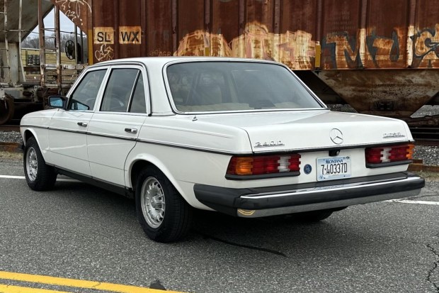 This 1982 Mercedes-Benz 240D was purchased by the current owner in 2021 and is equipped with a four-speed manual transmission. The car has been refinished in Classic White over a Palomino MB-Tex interior and is powered by a 2.4-liter diesel inline-four. It features 14″ Bundt alloy wheels, cruise control, and a cassette stereo. This W123 240D shows 155k miles and is offered by the seller, a BaT Local Partner, in Rhode Island at no reserve with a clean Carfax report and a clean Montana title in the name of the owner’s LLC.