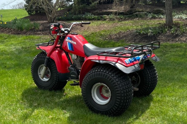 This 1984 Honda ATC 200ES Big Red is a three-wheeler that was acquired by the seller in March 2026, reportedly from its long-term second owner. Finished in red with white and two-tone blue graphics, the ATC is powered by an air-cooled 192cc four-stroke single linked with an automatic clutch, a five-speed dual-range gearbox with reverse, and an enclosed driveshaft. It is further equipped with a recoil starter, a 22mm Keihin carburetor, a telescopic fork, front and rear drum brakes, silver-finished 9″ wheels, trail lighting, a black vinyl-upholstered seat, plastic fenders, black plastic mud flaps, front …