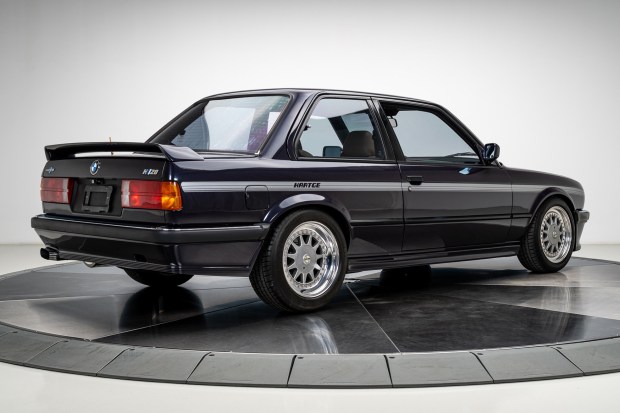 This 1985 BMW 323i coupe is believed to have been modified with Hartge components to the company’s H26 specification before being brought to the US in the early 1990s. Circa 2016 the car underwent chassis repairs and a repaint prior to being fitted with a CAtuned-built M20B25 stroker inline-six. The coupe wears a Hartge-style rear wing and lower bodywork along with gray side stripes and rides on 16″ multi-piece wheels. Inside, tan leather–trimmed front sport seats are accompanied by a MOMO steering wheel, a retrofitted VDO instrument cluster, and a Blaupunkt stereo receiver. Shifting is through a five- …