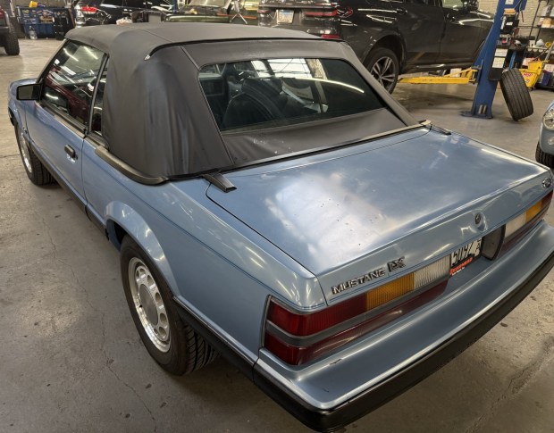 This 1985 Ford Mustang LX convertible is powered by a 302ci Windsor V8 that was rebuilt in 2025 and is paired with a four-speed automatic transmission. Acquired by the current owner in 2023, the car also received a suspension overhaul and a replacement black convertible top. It is finished in Light Regatta Blue Metallic over Regatta Blue vinyl. Equipment includes the Power Lock Group, 15″ alloy wheels, cruise control, and air conditioning that was converted to R134a refrigerant. This Fox-body Mustang LX shows 92k miles and is now offered on dealer consignment at no reserve with partial ser …