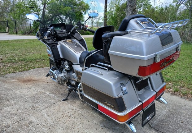 This 1986 Honda GL1200A Gold Wing Aspencade spent time in Illinois before its 2022 acquisition by the seller. Powered by a liquid-cooled 1,182cc SOHC flat-four linked with a five-speed transmission, the bike is finished in metallic silver with contrasting accents and gold-finished badges. It also features an enclosed driveshaft, an electric starter, solid-state ignition, a quartet of CV carburetors, a pair of turn-down exhaust mufflers, air-adjustable suspension, triple disc brakes, cast alloy wheels, an aftermarket windshield, a Honda-Panasonic Type III cassette stereo, two-up seating, a rear parcel rack, a molded top box and side cases, rider and passenger backres …