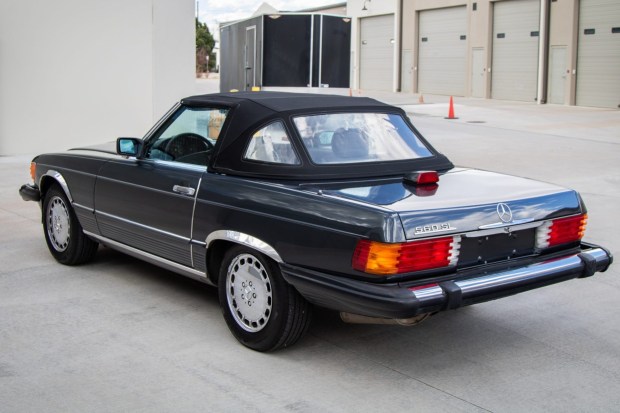 This 1986 Mercedes-Benz 560SL is finished in Blue Black Metallic over gray leather and is powered by a 5.5-liter V8 paired with a four-speed automatic transmission. Features include a limited-slip differential, a black soft top, a removable hardtop, chrome-plated 15″ Gullideckel alloy wheels, fog lights, a Becker AM/FM/cassette stereo, an alarm system, electric windows, central locking, automatic climate control, and an inoperable cruise control system. The selling dealer acquired the car from the third owner in 2026, and it now shows 117k miles. This R107 is offered at no reserve with a clean Carfax report and a clean Colorado title.