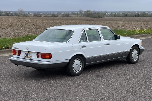 This 1987 Mercedes-Benz 560SEL was repainted white in April 2026, and work at Kauth & Mayeur of Peoria, Illinois, in the past five years has included rebuilding the four-speed automatic transmission, replacing the camshafts for the 5.5-liter M117 V8, and replacing the timing chain, ignition components, A/C blower motor and compressor, shifter bushings, and rear brake calipers. Equipment includes a limited-slip differential, steel sunroof, a self-leveling hydraulic rear suspension, 15″ Gullideckel alloy wheels, heated power-adjustable front seats upholstered in gray leather, heated power-adjustable rear seats, automatic climate control, a Kenwood stereo, and cruise control. Acquired by the current …
