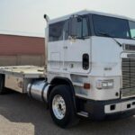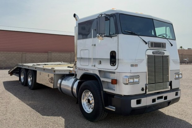 This 1989 Freightliner FLA086 cab-over-engine car hauler is powered by a 14.0-liter Cummins turbodiesel inline-six paired with an Eaton Fuller Roadranger manual transmission. It is finished in white, silver, and black with custom pinstriping over tweed cloth and brown vinyl upholstery. Acquired by the owner in 2021, the truck features a hauler bed with tie-downs and slide-out ramps along with a forward-tilting sleeper cab, air conditioning, dual fuel tanks, a dually rear axle, an engine compression brake, and a locking inter-axle differential. This Freightliner car hauler is now offered by the seller …