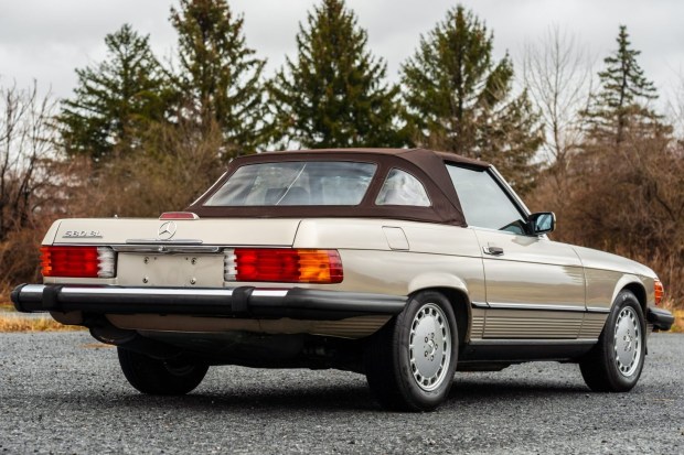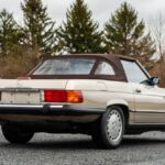 This 1989 Mercedes-Benz 560SL was first registered in Georgia and spent two decades in New York before relocating to Pennsylvania, and it now shows 28k miles. Finished in Smoke Silver Metallic over Dark Brown leather upholstery, the car is powered by a 5.5-liter V8 paired with a four-speed automatic transmission. Features include a limited-slip differential, a dark brown soft top, a removable hardtop, silver-finished 15″ Gullideckel alloy wheels, fog lights, a Becker AM/FM/cassette stereo, electric windows, central locking, cruise control, and automatic climate control. Acquired by the selling dealer in 2026, this R107 is offered …