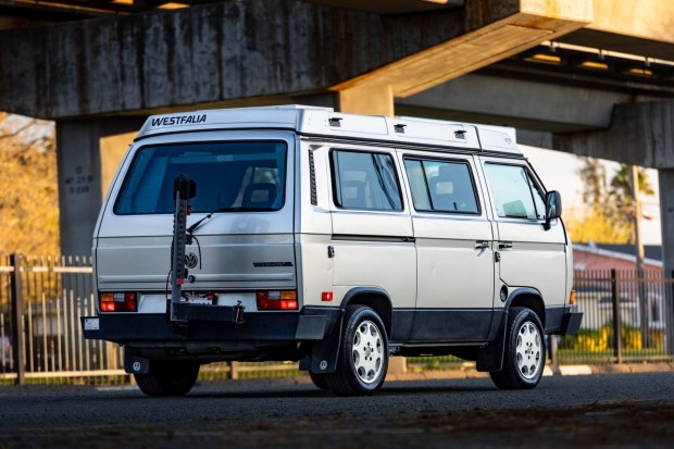 This 1990 Volkswagen Vanagon Westfalia was registered in California before being acquired by the current owner at GoWesty of Los Osos, California, in 2008. Work under current ownership involved installing a GoWesty liquid-cooled 2.5L flat-four, a rebuilt three-speed automatic transaxle, a replacement exhaust system, a front big-brake kit, a 2″ lift kit, a rewired electrical system with a 1000-watt power inverter and dual auxiliary batteries, and more. Finished in silver over gray cloth, the van also features a pop-up camper roof, a skylight, a sliding right-side door, a Thule rear bicycle rack, two solar panels, Alamak-style 16″ wheels, air con …