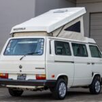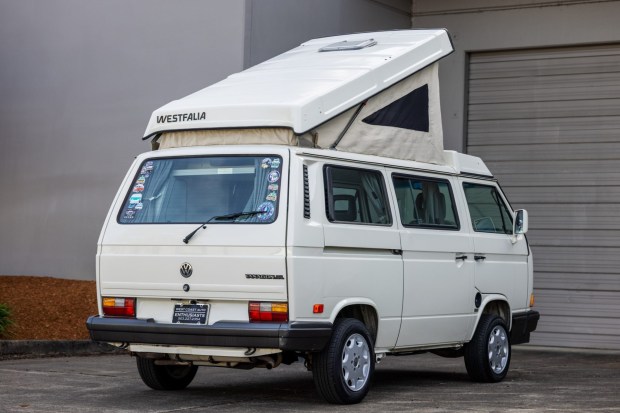 This 1990 Volkswagen Vanagon Westfalia GL is powered by a replacement water-cooled 2.1L flat-four paired with a three-speed automatic transaxle and is finished in white over gray cloth. The van features a pop-up camper roof, a skylight, 15″ Alamak-style wheels, Bilstein shocks, revised front disc brakes, swiveling front bucket seats, a folding rear bench, a storable swivel table, a rearview camera, window curtains, a water storage tank, and a kitchenette with a stove, a refrigerator, and a sink. Recently acquired by the selling dealer, this T3 shows 208k miles and is now offered at no reserve with a window sticker, manufacturer’s literature, partial service records, maps, c …