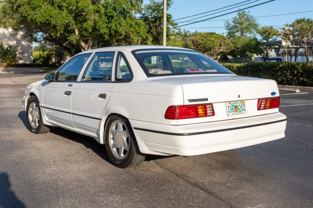 This 1991 Ford Taurus SHO is powered by a 3.0-liter V6 paired with a five-speed manual transaxle and is finished in white over tan leather and cloth upholstery. Equipment includes four-wheel anti-lock disc brakes, 16″ “Slicer” cast aluminum wheels, fog lights, and SHO-specific bumpers and side cladding, as well as air conditioning, an Alpine stereo, trunk-mounted aftermarket audio equipment, cruise control, keyless entry, and power-adjustable front sport seats. Purchased by the seller in 2024, this Taurus SHO is offered at no reserve with spare parts, an accident-free Carfax report, and a clean Florida title in the seller’s name.