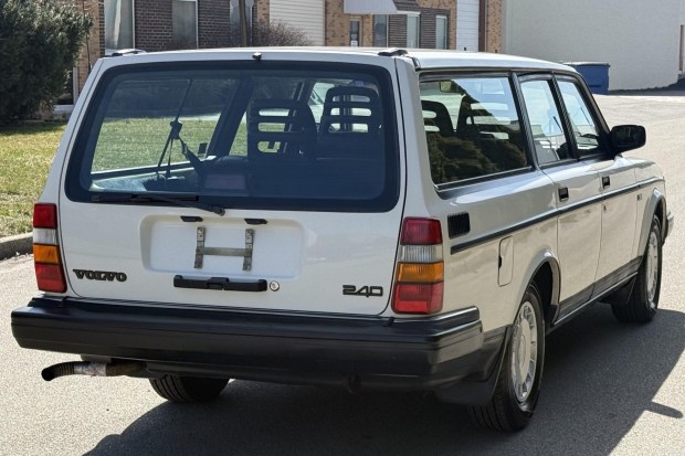 This 1992 Volvo 240 wagon is finished in white over blue vinyl and is powered by a 2.3-liter inline-four linked with a four-speed automatic transmission with overdrive. Equipment includes 14″ steel wheels with aerodynamic covers, power steering, black bumpers and trim, mudguards, a cassette stereo, and air conditioning. Acquired by the selling dealer in 2026, this 240 wagon is now offered at no reserve with a clean Carfax report and a clean Pennsylvania title.
