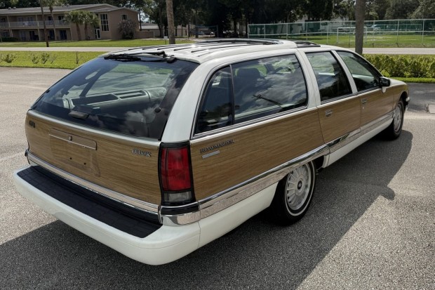 This 1993 Buick Roadmaster Estate Wagon shows 55k miles and is said to have been registered with one family through 2019, after which it was sold on BaT in November 2025 and acquired by the selling dealer. Finished in Arctic White over Camel leather and vinyl, it has auto-leveling rear suspension, 15″ aluminum wheels, power-adjustable front seats, Twilight Sentinel automatic headlights, a Vista Roof, a rear-facing third-row bench, a cassette stereo, and automatic climate control. Power comes from a 5.7-liter V8 paired with a four-speed automatic transmission. In 2025, the front brake calipers, ABS pump, air conditioning compressor, and radiator were replaced, and the differential was resealed. This Roadmaster Estate is …