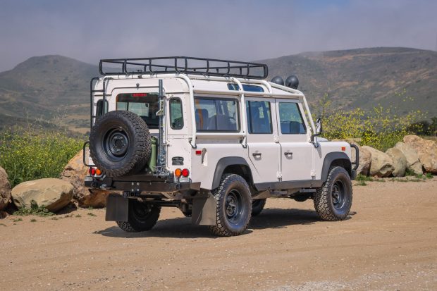 This 1993 Land Rover Defender 110 NAS is #99 of approximately 525 North American Specification examples produced for the single model year. The Alpine White truck was refurbished by Pikes Peak Rovers of Colorado Springs, Colorado, during a process that cost more than $200k and involved installing a 4.6-liter V8. The engine is linked to an R380 five-speed manual transmission, a dual-range transfer case, a locking center differential, and ARB Air Locker front and rear differentials. Other equipment includes a galvanized chassis, an external roll cage, an ARB front bumper and brush guard, a Warn winch, a snorke …