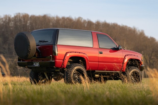 This 1994 Chevrolet Blazer K1500 was registered in California and Nevada for more than 30 years. It was refurbished and modified during a $48k build in 2019 by Apex of Arizona, which included replacing its 5.7 V8 and four-speed automatic transmission. Another $9k was spent on work in 2021, followed by $7k in services in 2024 for the air conditioning, power windows and locks, steering, and suspension. The truck is finished in Candy Red Metallic, and it features a 5″/4″ lift kit, 35″ tires, 20″ Fuel wheels, four-wheel disc brakes, power-retractable side steps, shorty headers, a Flowma …
